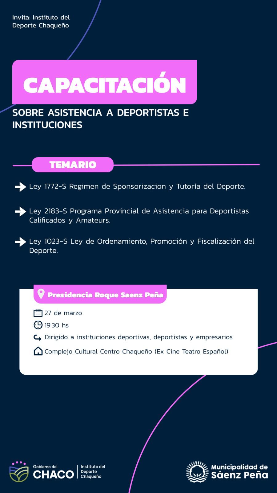 Presidencia Roque Sáenz Peña será escenario, hoy miércoles 27 de marzo, de la Capacitación sobre Asistencia a Deportistas e Instituciones organizada por el Instituto del Deporte Chaqueño en forma conjunta con el municipio de la Ciudad Termal. La misma comenzará a las 19.30 Hs y se desarrollará en la sala del ex cine-teatro Español, ubicado en calle 25 de mayo 643 de dicha localidad.