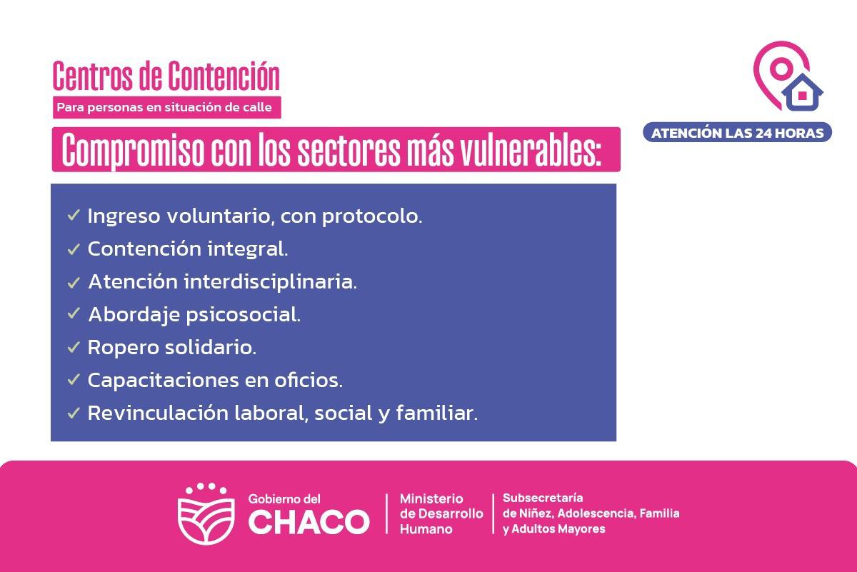 Los demás Centros de Contención para Personas en Situación de Calle, están también en Resistencia: Formosa 634 (11 residentes al momento), Fortín Alvarado 336 (18 residentes), Santa Fe 461 (18 residentes), Padre Cerqueira 1780 (10 residentes). Todos reciben alimentación, abrigo y otras asistencias.