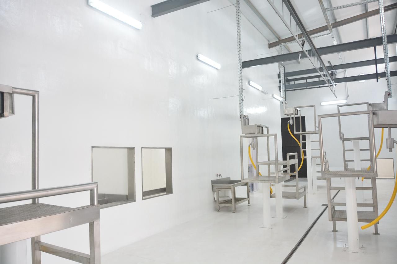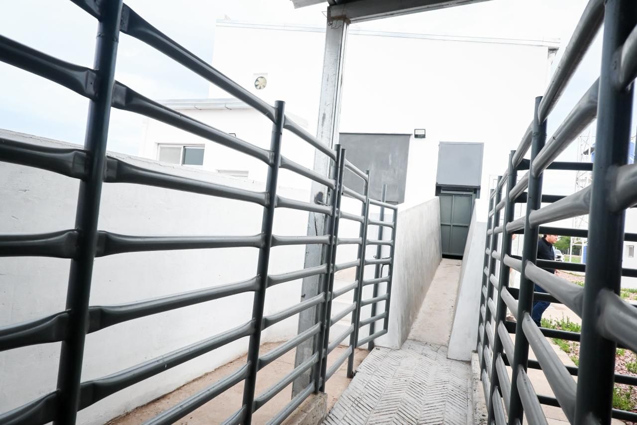La primera etapa incluyó la construcción del edificio principal —financiado íntegramente con fondos provinciales— con unos 350 metros cuadrados cubiertos que albergan áreas de embarcadero, noqueo, insensibilización, zonas de faena diferenciadas, cámara frigorífica con paneles térmicos, sanitarios y sectores operativos destinados al personal.