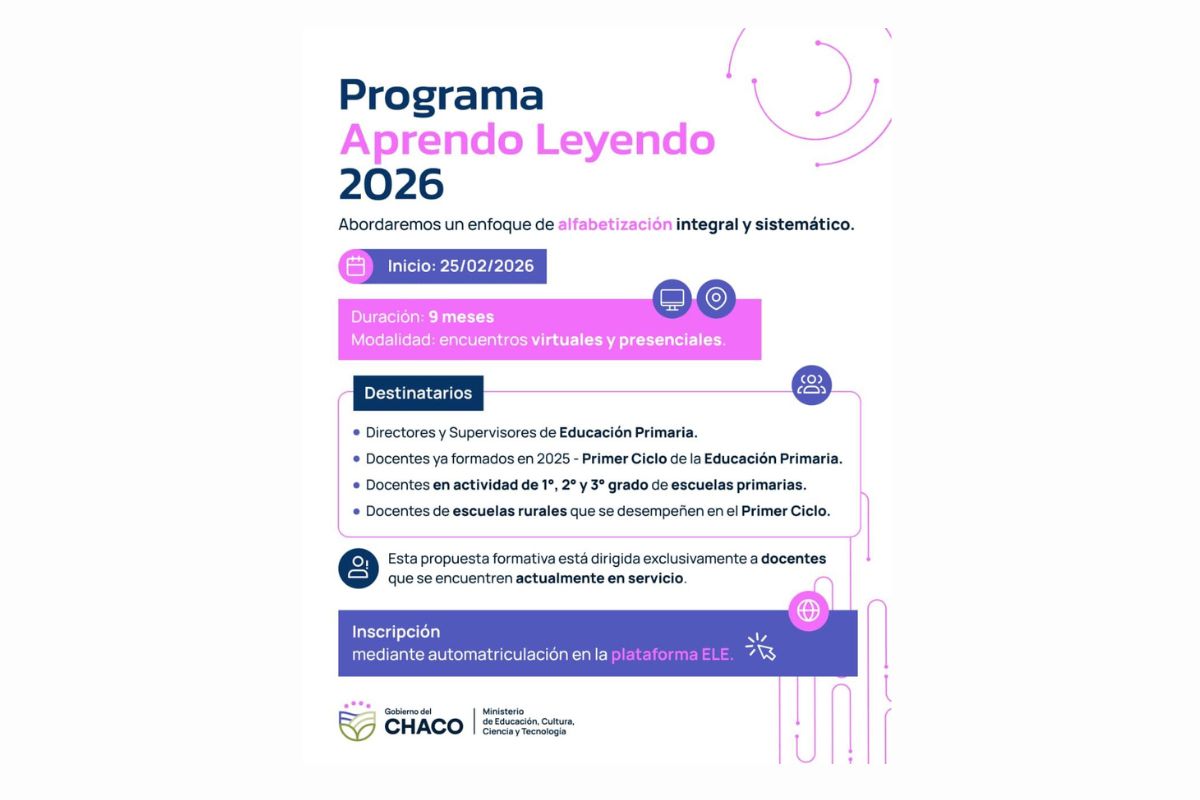 El Ministerio de Educación de la provincia informa que se encuentran abiertas las inscripciones para el curso de formación docente del programa Aprendo Leyendo 2026, una de las acciones centrales enmarcadas en el Compromiso Federal por la Alfabetización.