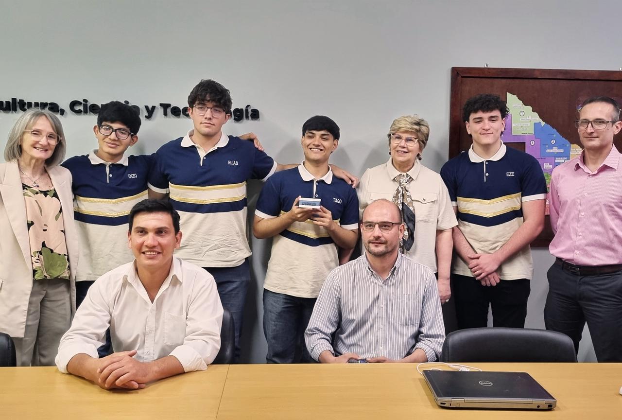 En esta oportunidad, los estudiantes Tiago Sánchez Ojinaga, Ezequiel Widera, Elías Pavich Bois y Enzo Soto, acompañados de su profesor guía Alexis Ocampo y del director de la Escuela, Victor Castillo, presentaron a la ministra Naidenoff, a la subsecretaria de Educación Isabel Sanchuk y al director de Educación Técnica, Damian Berger; su proyecto ganador, denominado “Biomed”, un dispositivo médico, que a partir del registro biométrico tomado con la huella del paciente, permite acceder a los datos médicos de relevancia del mismo.