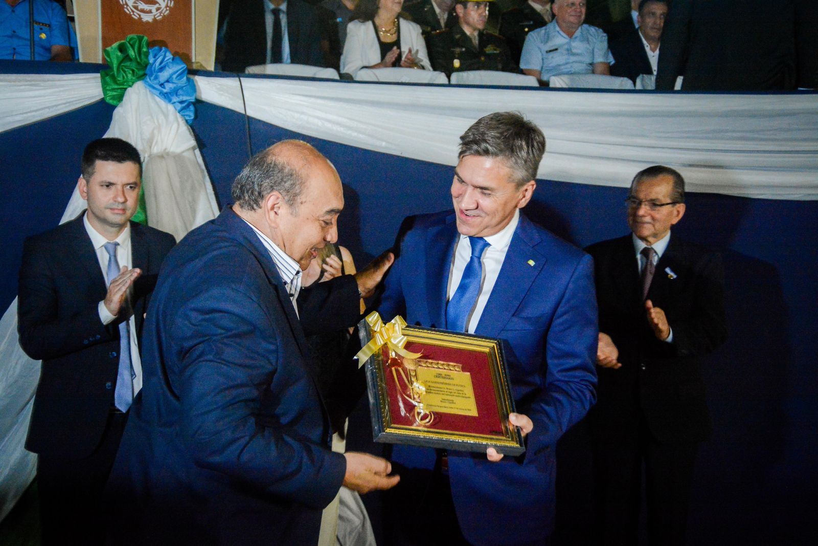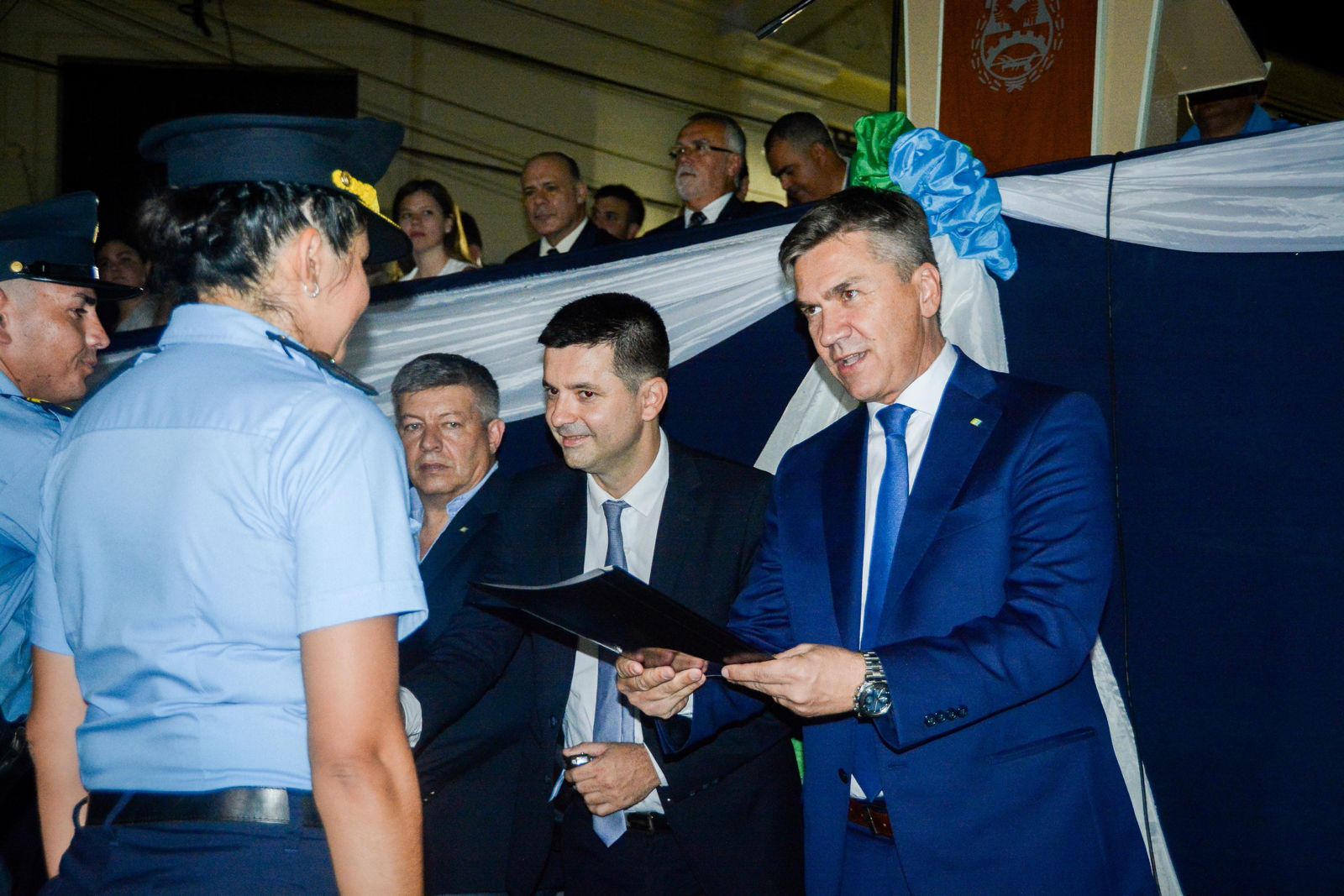 Durante el acto, el gobernador junto a las autoridades, entregó reconocimientos a pobladores de la ciudad termal; como así también uniformes y vehículos para las fuerzas de seguridad. En este sentido, el intendente Bruno Cipolini, también manifestó: “Con nuestras expectativas y esperanzas puestas en el futuro, pero con el reconocimiento a los hombres y mujeres que a lo largo de estos 112 años han dejado su huella en nuestra ciudad. Quiero agradecerle gobernador, por venir a acompañarnos en nuestro aniversario, y decirles a los vecinos que pongamos una mirada en los valores de la hermandad, la fraternidad, la unidad y el trabajo”.