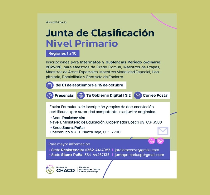El Ministerio de Educación de la Provincia, a través de las Juntas de Clasificación de Nivel Primario, con sedes en Presidencia Roque Sáenz Peña y Resistencia - que corresponden a las Regionales Educativas 1 a 10-, comunican que a partir del 1 de septiembre y hasta el 15 de octubre se llevarán a cabo las inscripciones para interinatos y suplencias período ordinario para maestros de grado común, maestros de Etapas, maestros de Áreas Especiales, Maestros de las modalidades Especial, Hospitalaria, Domiciliaria y de Contexto de Encierro.