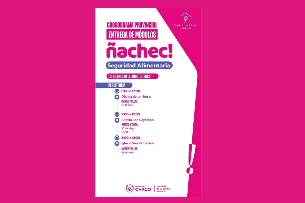 En el marco del programa Ñachec, el Gobierno provincial informa el cronograma de entrega de módulos alimentarios que se llevará a cabo este viernes 10 de abril en distintos puntos de la ciudad de Resistencia.