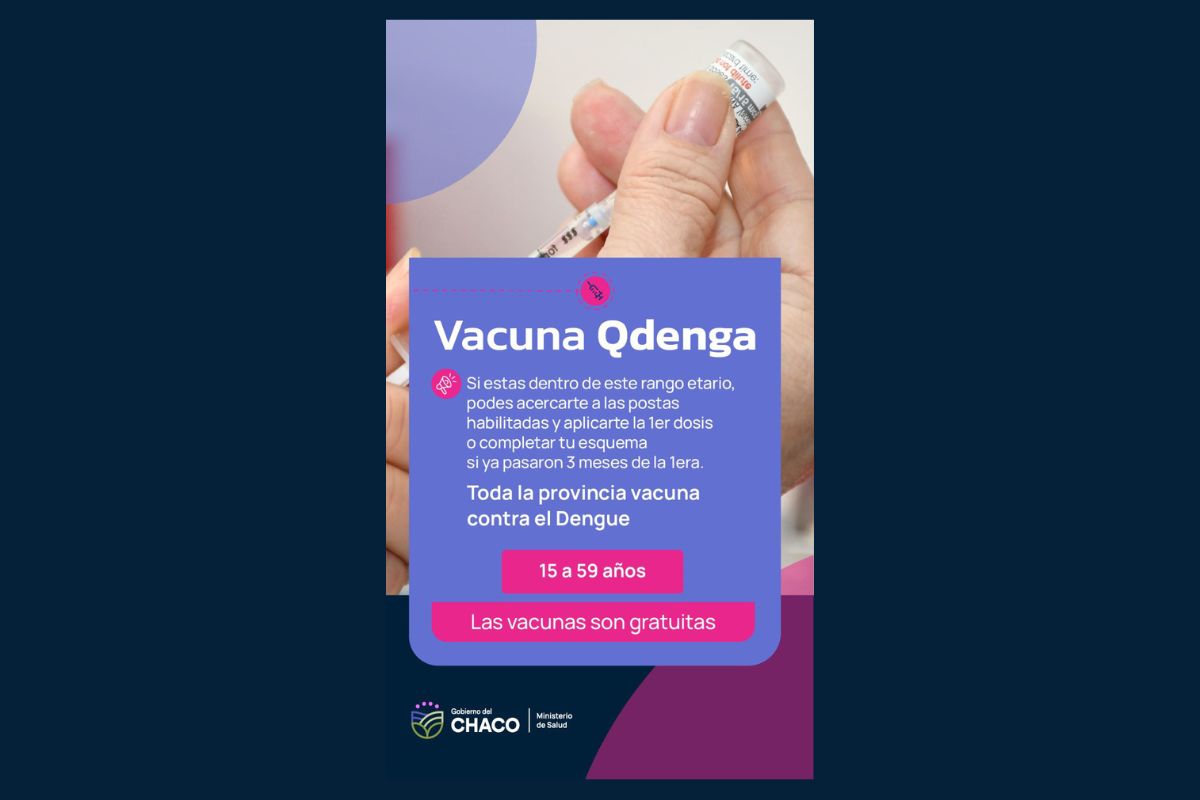 En paralelo, el Ministerio de Salud continúa con la campaña de vacunación contra el Dengue en toda la provincia. La vacuna Qdenga está destinada a personas de entre 15 y 59 años, quienes pueden acercarse a las postas habilitadas, Centros de Salud o puestos sanitarios para aplicarse la primera dosis o completar el esquema, en caso de que hayan transcurrido tresSALUD REFUERZA LAS MEDIDAS DE PREVENCIÓN CONTRA EL DENGUE meses desde la primera aplicación.