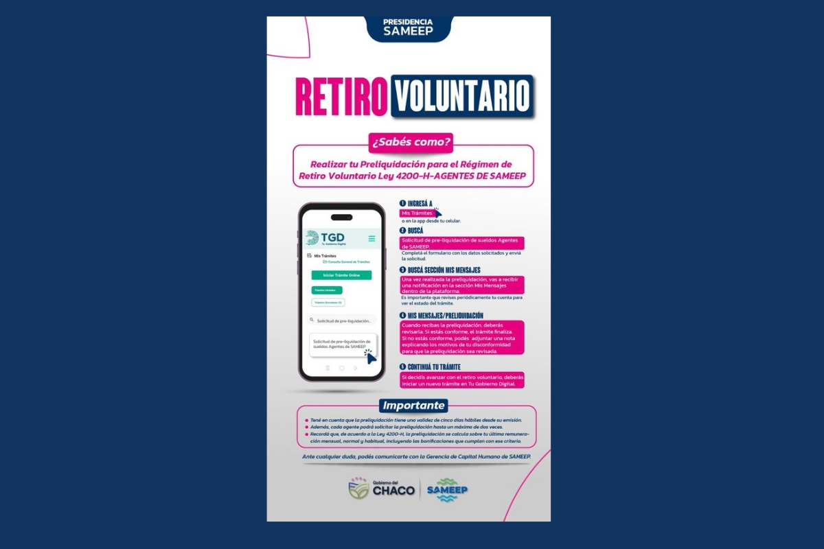 La empresa estatal Sameep informó que su Directorio resolvió adherir, mediante la Resolución N° 032/26, al Régimen de Retiro Voluntario Móvil dispuesto por el Gobierno provincial a través de la Ley N° 4200-H y su Decreto Reglamentario N° 186/26, una medida orientada al personal de la Administración Pública.