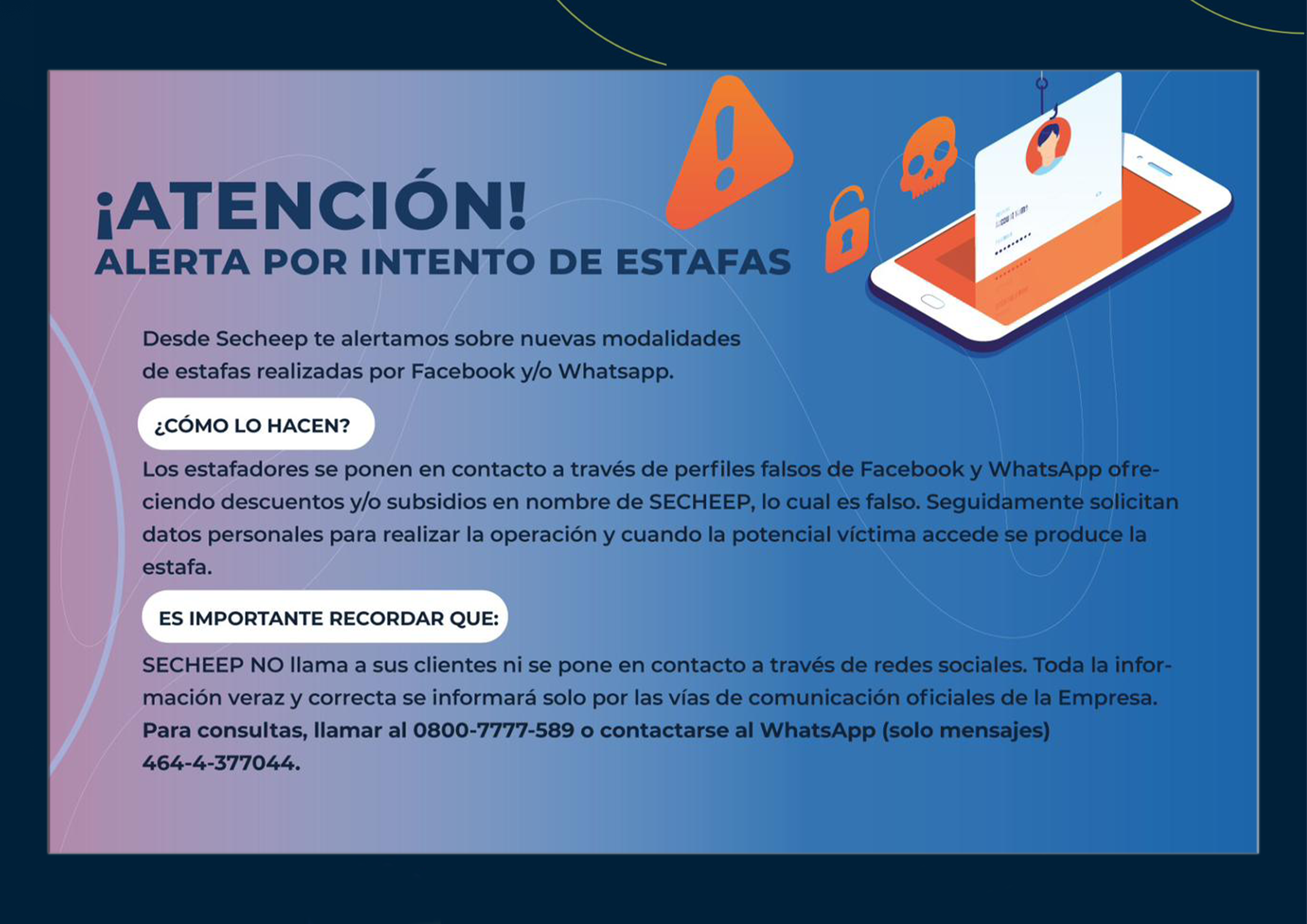 SECHEEP alerta y advierte a la comunidad sobre la aparición de modalidades de estafa que, a través de perfiles de falsos de Facebook y/o de llamados telefónicos o de WhatsApp, ofrecen supuestos descuentos en el pago de facturas e inscripciones a subsidios utilizando el nombre del organismo provincial.