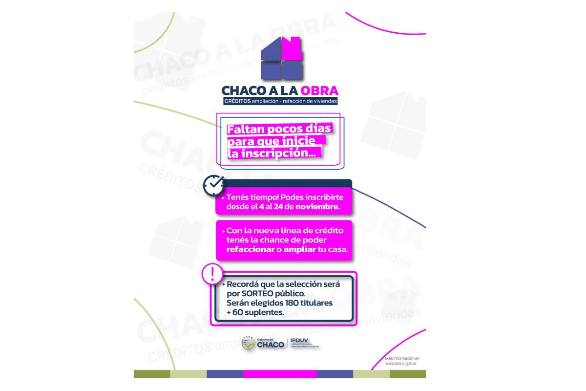 La línea contará con tres modalidades: una de cuatro millones, otra de siete millones y una tercera de diez millones. La inscripción para acceder a estos créditos comenzará el 4 de noviembre y se extenderá hasta el 25 de este mes. Es importante señalar que el proceso se realizará exclusivamente en ipduv.chaco.gob.ar, sin atención presencial, mientras que toda la información de la operatoria será cargada en dicho sitio como también en las redes sociales del organismo.
