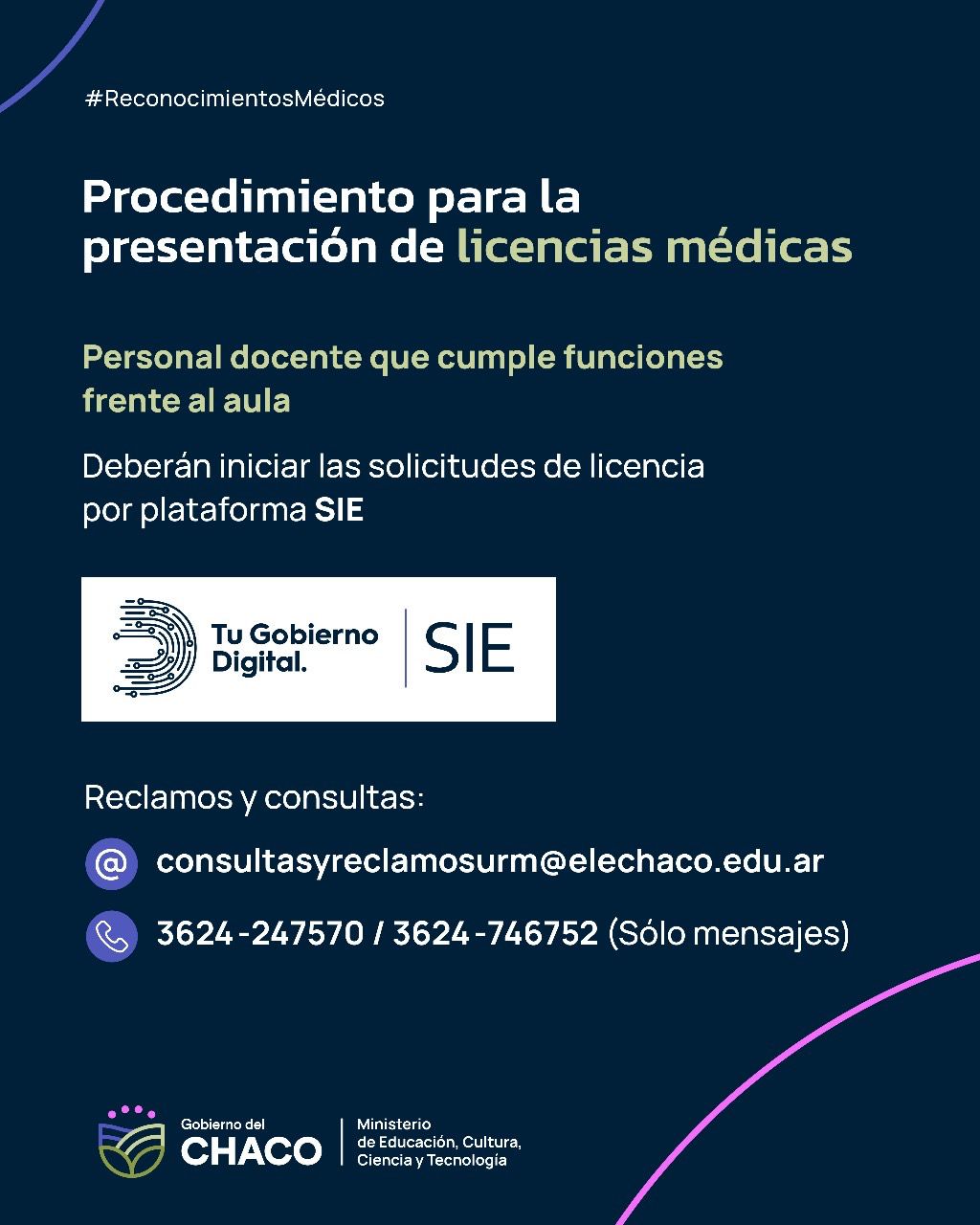 Desde principio de este año, el Ministerio de Educación trabaja en la optimización del sistema virtual para la presentación de pedidos de licencias por enfermedad para docentes, en la Unidad de Reconocimientos Médicos, la que recepciona este trámite por medio de la plataforma del Sistema Integral de Educación (SIE), que se encuentra en Tu Gobierno Digital (www.tugobiernodigital.chaco.gob.ar).