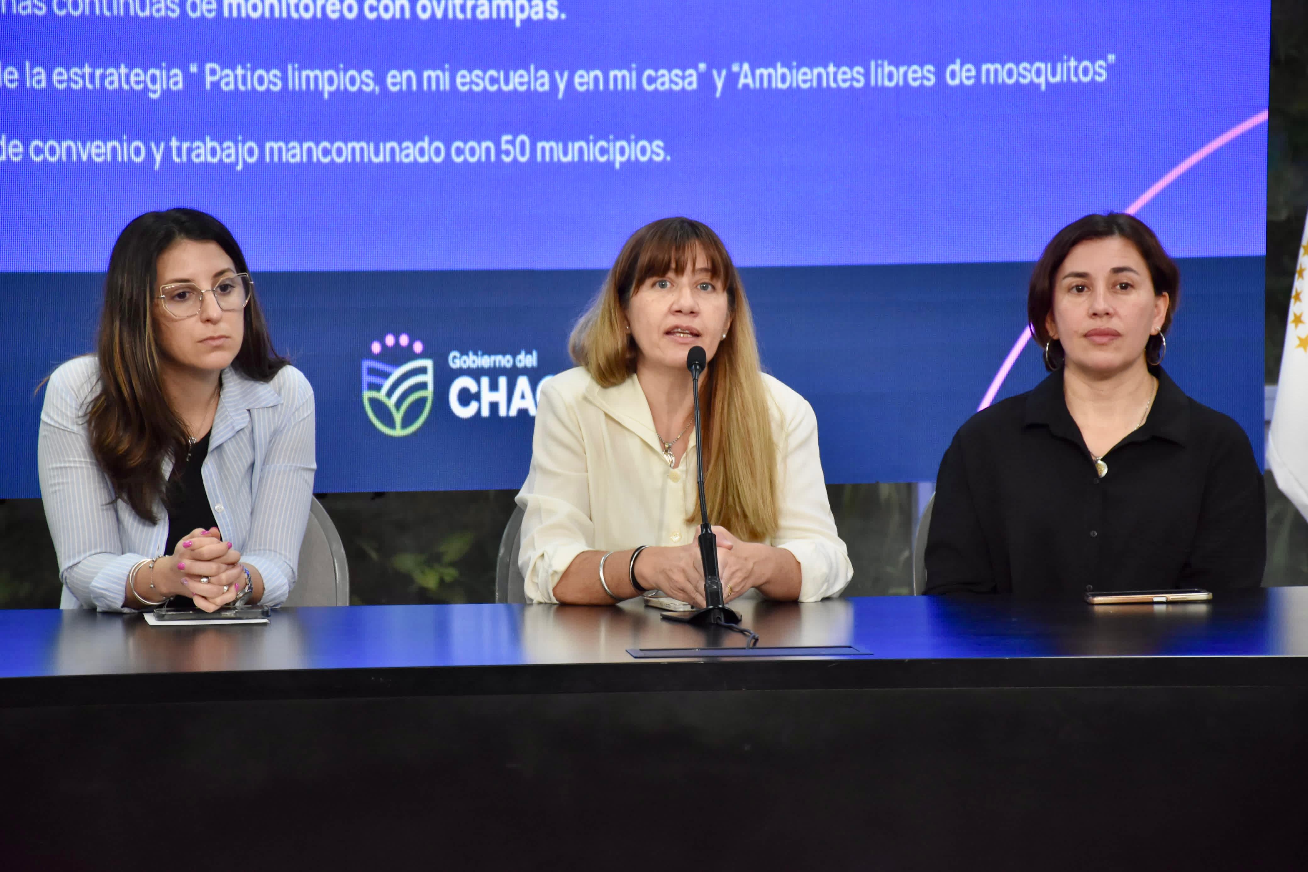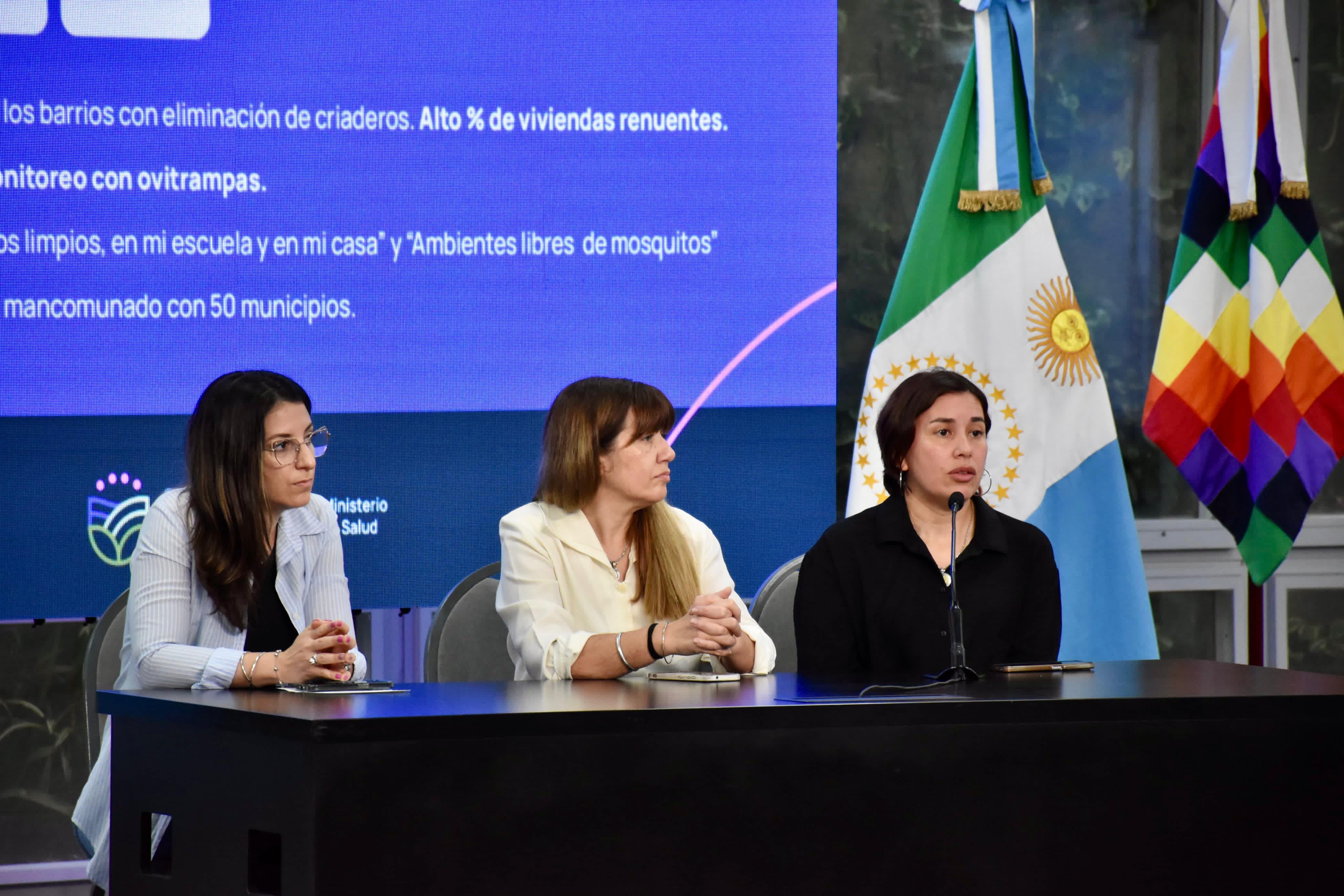 En el Salón Obligado de Casa de Gobierno, la subsecretaria de Promoción de la Salud y Prevención de Enfermedades, Dra. Antonieta Cayré, analizó la situación epidemiológica de la provincia en base a estadísticas disponibles del año 2023 hasta la actualidad, destacando la baja en la curva de casos posterior al brote del verano pasado. También participaron la directora de Epidemiología, Dra. María Elisa Flores, y la jefa del Departamento de Enfermedades de Transmisión Vectorial, Dra. Yanina Maza.