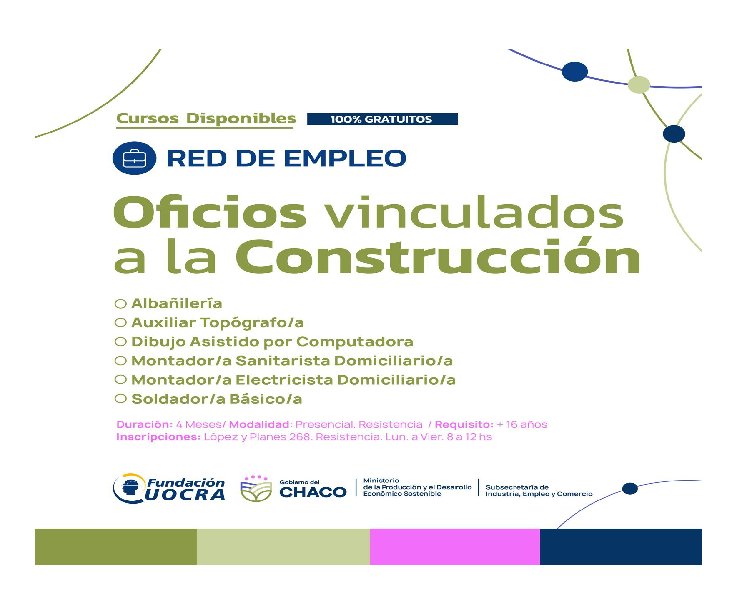 El gobierno provincial, a través del Ministerio de la Producción y el Desarrollo Económico Sostenible del Chaco, junto a la Escuela de Formación Profesional de la Fundación UOCRA, anunciaron que se encuentra abierta la inscripción a los cursos de oficios vinculados al rubro de la construcción, que darán comienzo en el próximo mes de agosto, dirigido a personas mayores de 16 años, con una duración de 4 meses, modalidad presencial en Resistencia y sin costo alguno.
